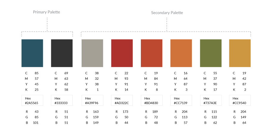The palette represents the spectrum of acceptable brand identity colors and should be used for all types of media. The primary palette represents the colors that should be used the most and the secondary palette represents the colors that should be used as accents. No other colors should ever be used.